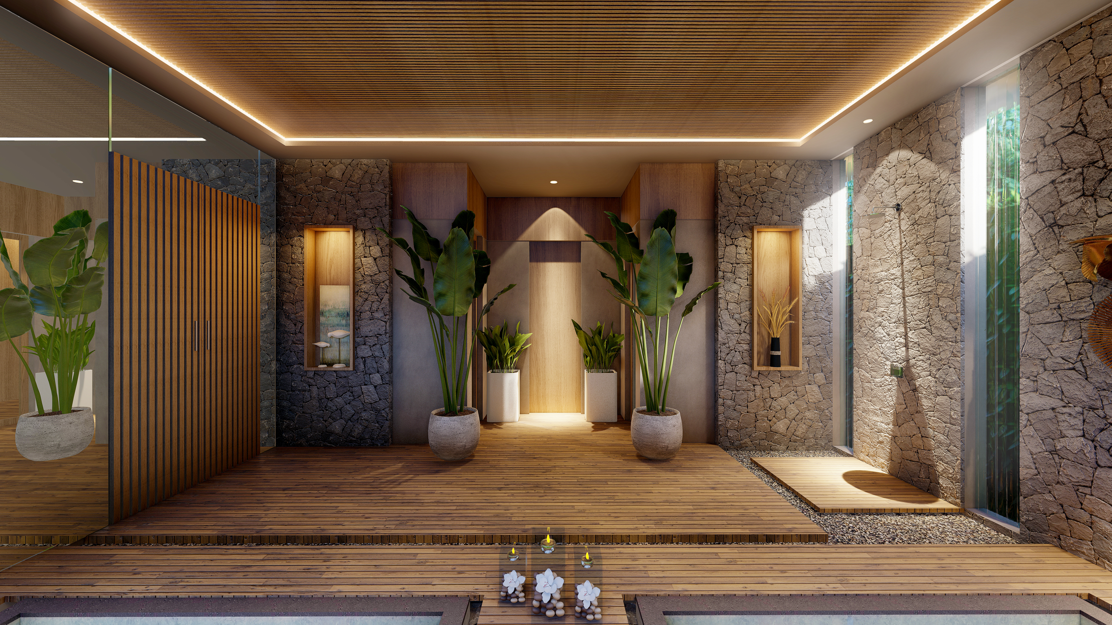 The sauna is a serene retreat, enveloped in a calming atmosphere. Natural stone accents adorn the walls, contributing to the spa-like ambiance. Every element of this space is meticulously crafted to support the client’s wellness journey.