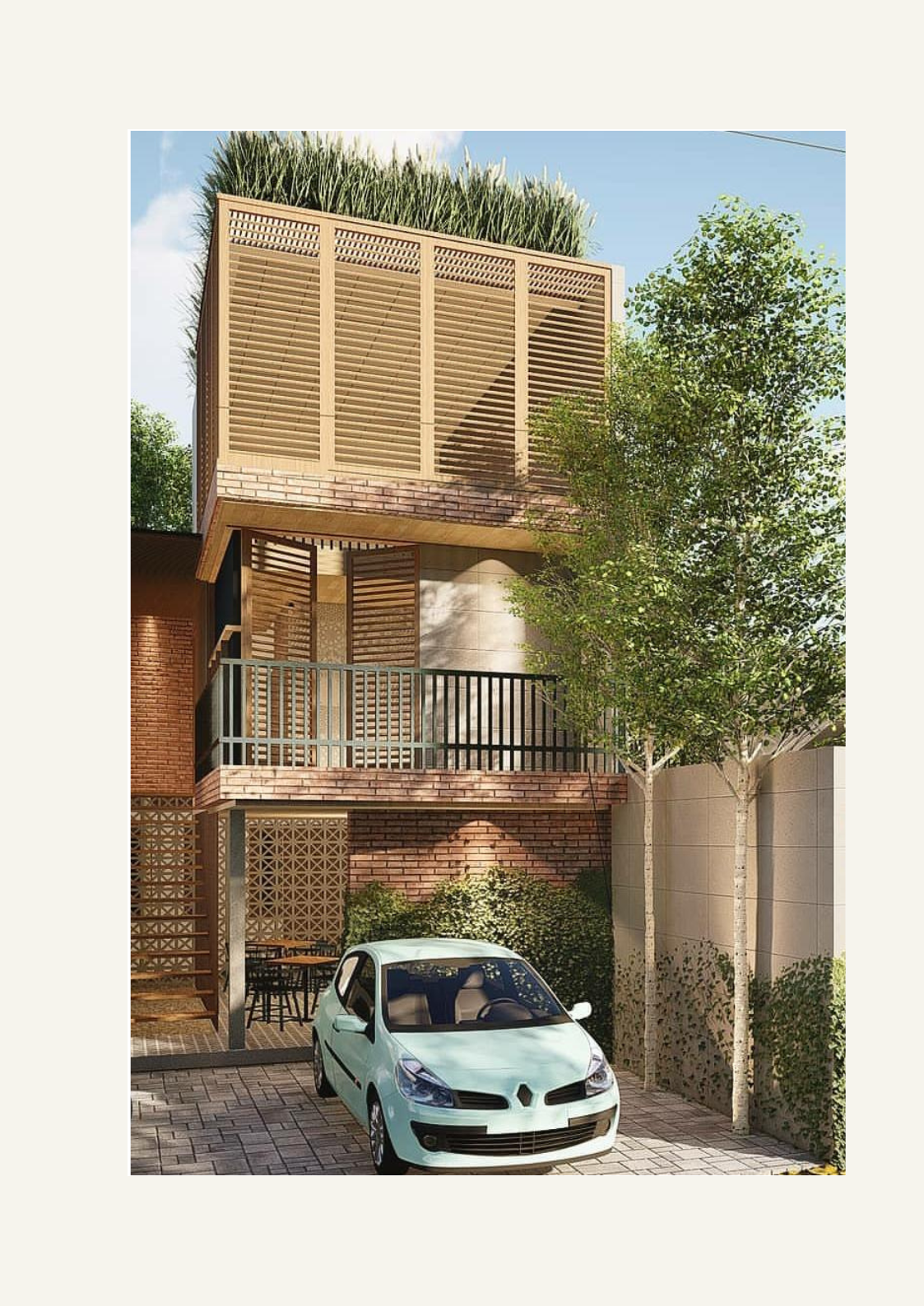 The material selection lends a sense of warmth and tropical to the building, while also harmonising with the lush greenery that surrounds it.
